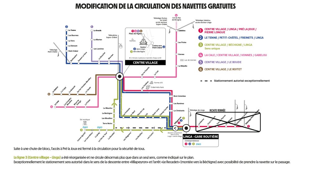 ◾ Ligne 1 (Rouge) : Centre village / Linga / Pré la Joux 1 bus toutes les 15 mn à partir de 8h.