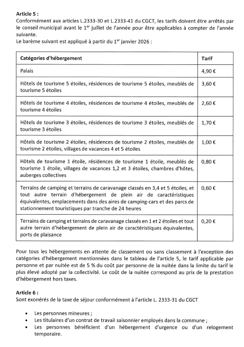 Tarifs de la taxe de séjour valable dès le 1er janvier 2026